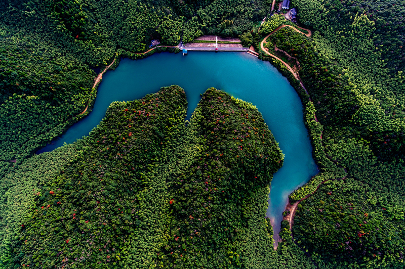 龍塢水庫像一彎藍色月牙,鑲嵌在連綿的山谷與竹林之間。黃湖鎮供圖