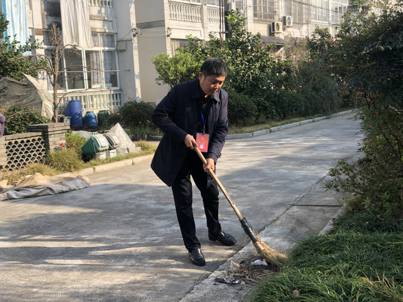 湖州市人大代表、鐘管村黨委書記沈建宏正在清掃路面。鐘海攝