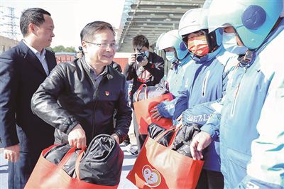 為小哥送上秋冬關懷禮包。余杭區市場監管局提供