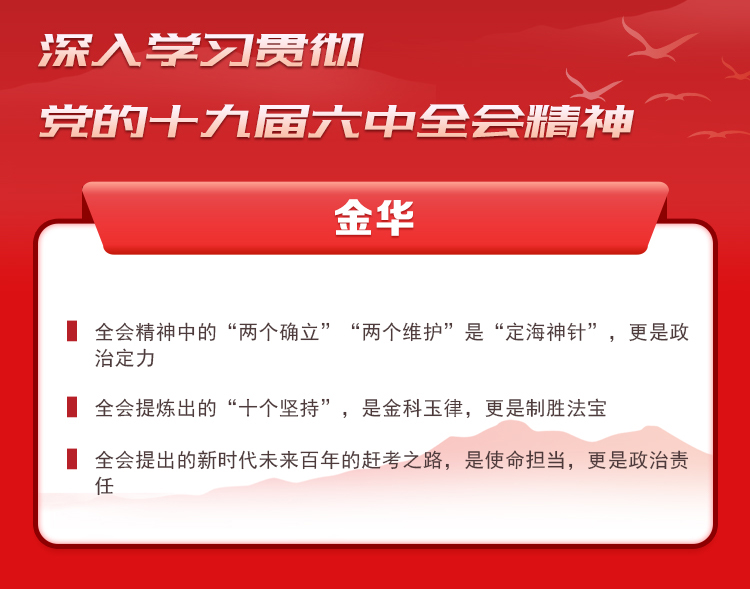 會議強調,全市上下要進一步學習好、宣講好、貫徹好全會精神,進一步增強政治定力、鑄牢“定海神針”,用“十個堅持”歷史經驗指導金華發展新實踐,把全會精神轉化為推動工作的強大動力,奮力推進金華整體性、系統性、本質上趕超爭先。