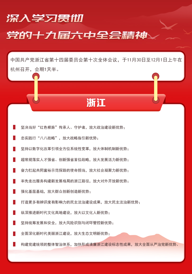 全會深入學習貫徹黨的十九屆六中全會精神,聽取和討論省委常委會工作報告、關于學習貫徹黨的十九屆六中全會精神的報告,審議通過《中國共產黨浙江省第十四屆委員會第十次全體會議關于深入學習貫徹黨的十九屆六中全會精神 堅定不移做“兩個確立”忠誠擁護者“兩個維護”示范引領者的決議》《中國共產黨浙江省第十四屆委員會第十次全體會議關于召開中國共產黨浙江省第十五次代表大會的決議》,進一步動員全省上下從黨的百年奮斗歷程中不斷汲取智慧和力量,把思想和行動統一到六中全會精神上來,推動全省黨員干部堅定不移做“兩個確立”忠誠擁護者、“兩個維護”示范引領者,守好“紅色根脈”、打造“重要窗口”,高質量發展建設共同富裕示范區。