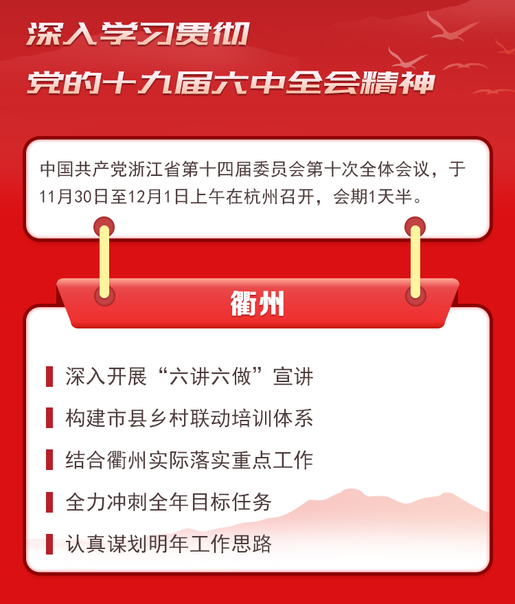 會議強調,要把學習宣傳貫徹黨的十九屆六中全會精神與學習宣傳貫徹省委十四屆十次全會精神緊密結合起來,深入開展“六講六做”大宣講活動,用好8090新時代理論宣講品牌,利用各種抓手載體,推動形成人人學、人人講的濃厚氛圍;構建市縣鄉村聯動的培訓體系,發揮好黨校、干部學院等主陣地作用,實現黨員干部培訓全覆蓋。要按照省委全會對8個方面重點工作的部署要求,緊密結合衢州實際,對標對表、一項一項抓好落實,用實際工作成果檢驗學習貫徹成效。