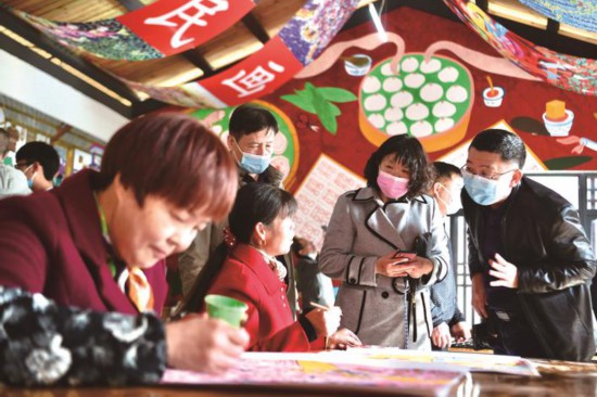 12月7日,在冬日暖陽下,嘉興秀洲區油車港鎮勝豐村菱瓏灣的幾名村嫂在創作農民畫,吸引來不少目光。這些農民畫作品表達了作者對生活的熱愛,展現了農村蓬勃向上的活力。(孟多多)