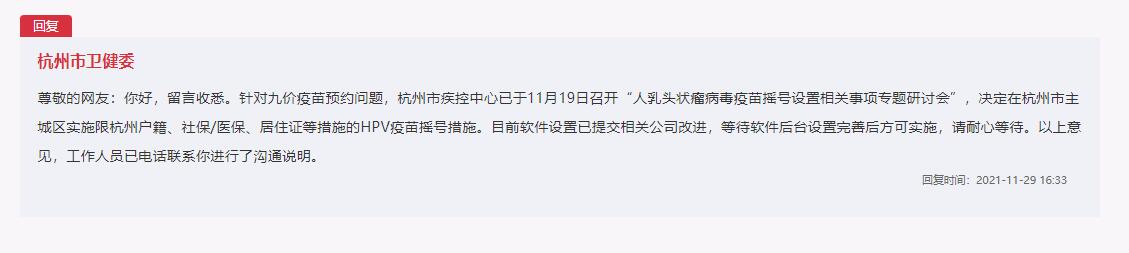 針對網友的建議,杭州市衛健委回復:針對九價疫苗預約問題,杭州市疾控中心已于11月19日召開“人乳頭狀瘤病毒疫苗搖號設置相關事項專題研討會”,決定在杭州市主城區實施限杭州戶籍、社保/醫保、居住證等措施的HPV疫苗搖號措施。
