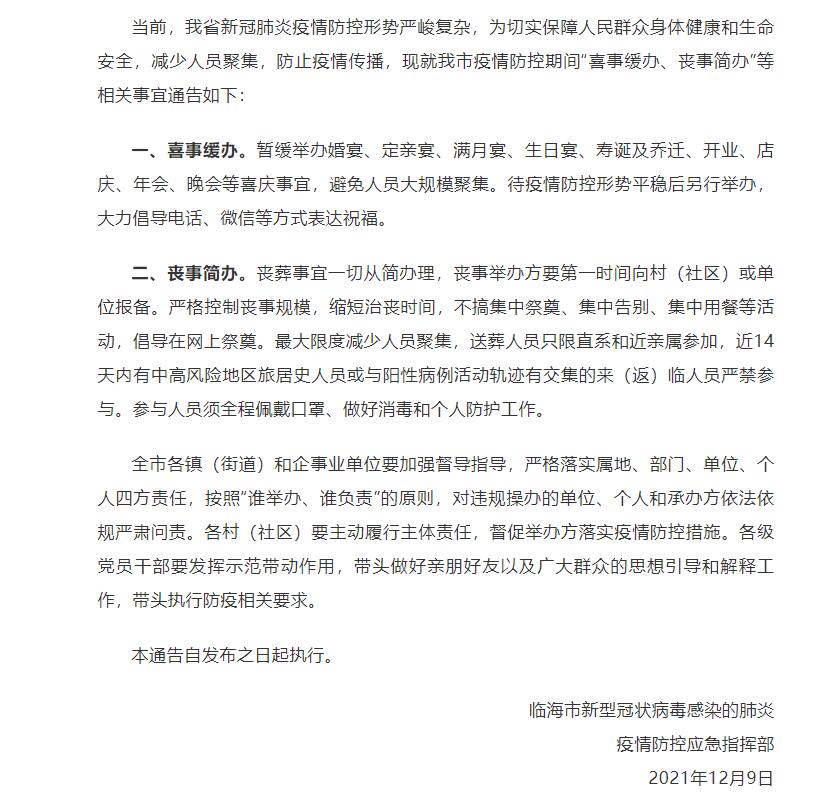 12月9日,臺州黃巖、臨海相繼發布關于進一步加強疫情防控措施的緊急通告,提倡“紅事緩辦”“白事簡辦”,并向所在村(社)報告,嚴格控制人員規模。