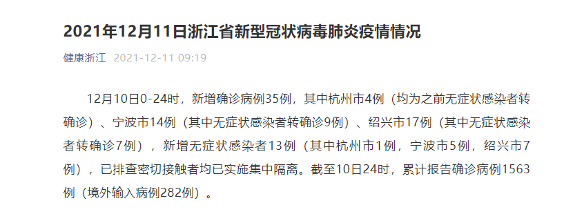 人民網杭州12月11日電 (艾宇韜)據浙江省衛健委通報,12月10日0-24時,浙江新增確診病例35例,其中杭州市4例(均為之前無癥狀感染者轉確診)、寧波市14例(其中無癥狀感染者轉確診9例)、紹興市17例(其中無癥狀感染者轉確診7例)。新增無癥狀感染者13例(其中杭州市1例、寧波市5例、紹興市7例)。