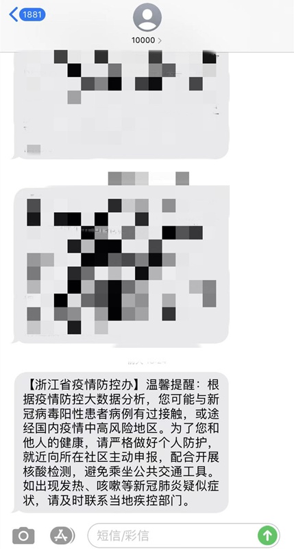 方女士表示,自己前一天晚上就收到了浙江省疫情防控辦發來的短信,內容為:“根據疫情防控大數據分析,您可能與新冠病毒陽性患者病例有過接觸,或途經國內疫情中高風險地區。為了您和他人的健康,請嚴格做好個人防護,就近向所在社區主動申報,配合開展核酸檢測,避免乘坐公共交通工具。如出現發熱、咳嗽等新冠肺炎疑似癥狀,請及時聯系當地疾控部門!