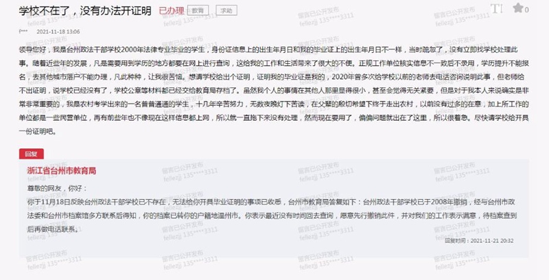 “領導您好,我是臺州政法干部學校2001年法律專業畢業的學生,身份證信息上的出生年月日和我的畢業證上的出生年月日不一樣,當時疏忽了,沒有立即找學校處理批示。隨著近些年的發展,凡是需要用到學歷的地方都要在網上進行查詢,這給我的工作和生活帶來了很大的不便。正規工作單位核實信息不一致后不錄用,學歷提升不能報名,去其他城市落戶不能辦理,凡此種種,讓我很苦惱。想請學校給出個證明,證明我的畢業證是我的……”11月18日,網友張先生在人民網“領導留言板”上反映了因學校已停辦注銷無法拿到學歷證明的難題。