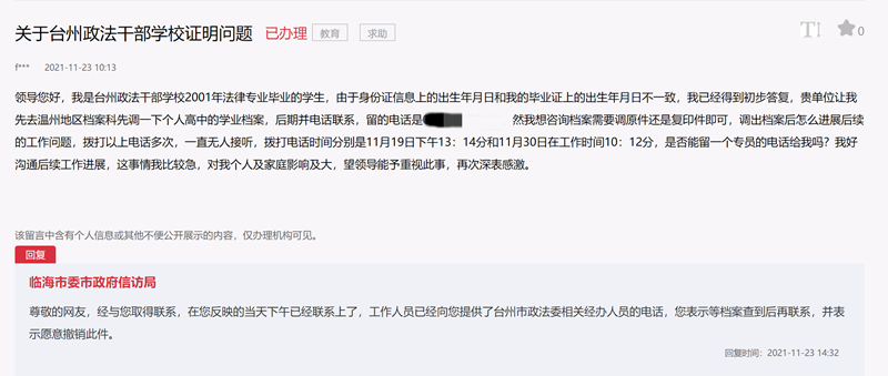 對此,浙江省臺州市教育局在對相關情況進行調查了解后作出回復:臺州政法干部學校已于2008年撤銷,經與臺州市政法委和臺州市檔案館多方聯系后得知,你的檔案已轉你的戶籍地溫州市。你表示最近沒有時間回去查詢,愿意先行撤銷此件,并對我們的工作表示滿意,待檔案查到后再做電話聯系。