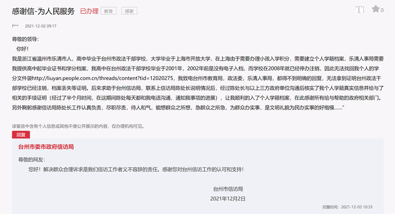 一籌莫展之際,張先生接到了臺州市信訪局辦信處(網上信訪辦公室)處長陳媚的電話!爱敃r真的不知道該怎么辦了,這時候陳處給我打了電話,讓我別著急!睋䦶埾壬榻B,陳媚在了解了他的具體情況后,分別與臺州市教育局、臺州市政法委、樂青市人事局等政府單位進行了溝通,后核實了他的個人學籍等真實信息!跋嚓P手續證明也有了,讓我順利地入了個人學籍檔案。在這半個月里,陳處每天都和我電話溝通,通知我具體事項的進展,也會告知我所需的一些個人材料,讓我提供給她,她幫我去和各部門溝通!睆埾壬f,“因為我上學那會兒還沒有電子檔案無法在網上查閱,陳處就到臺州市教育局一份一份地幫我找,真的特別感謝!