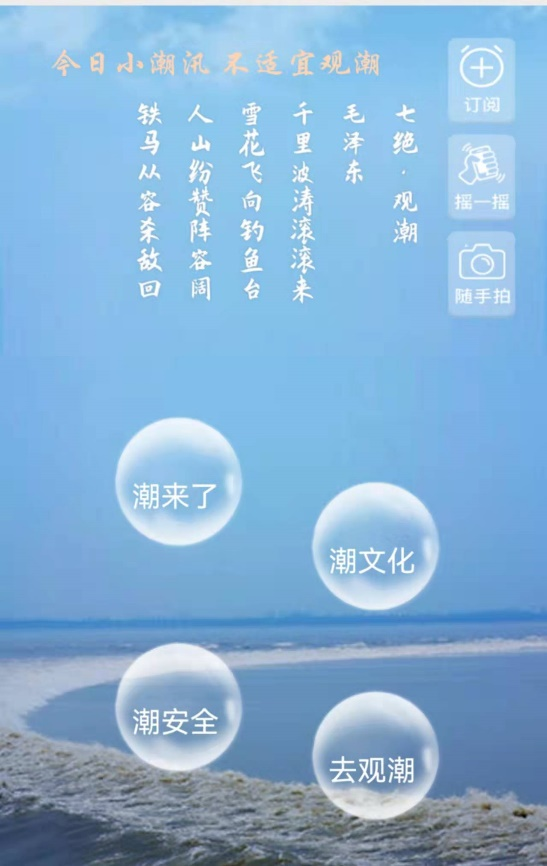 隨著數字化改革的推進,數字化監管手段也逐漸應用到了防潮工作上。杭州市林業水利局為了方便游客市民觀潮,特意上線了“智觀錢潮”微信公眾號。手機搖一搖,就能線上觀潮。該公眾號還提供了精準的潮汐預報,讓大家能提前去最佳觀察點蹲點守候,一睹錢塘潮的壯觀景象。