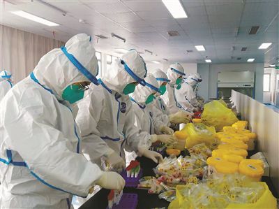 來自衢州的醫護人員在紹興核酸檢測基地高強度工作。
