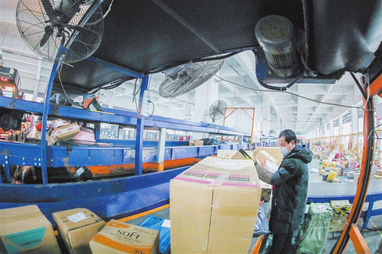 湖州高新區快遞湖州轉運中心的員工近日正在分揀快遞。該運轉中心每天配送快遞約15萬件,為保障快遞網點安全,在自動化快遞分揀運輸線上設立4臺噴霧式消毒裝置,確?爝f100%消殺。(陸一平)