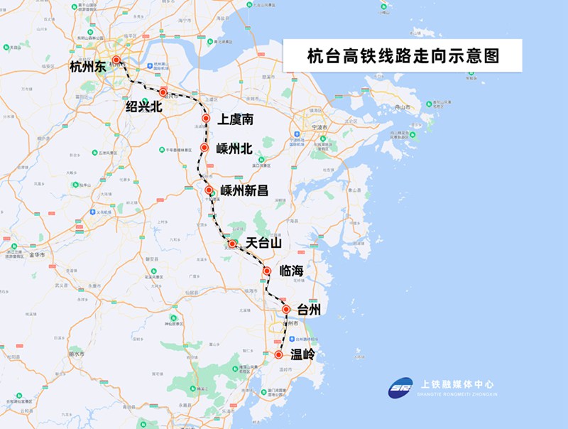 “杭臺高鐵連接浙江省杭州、紹興、臺州三市,北起杭州東站,杭州至紹興段利用既有杭深高鐵杭甬段,新建杭臺高鐵紹興至臺州段線路從紹興北站引出,經紹興市越城、上虞、嵊州、新昌和臺州市天臺、臨海、椒江、路橋、溫嶺等縣區,引入既有杭深高鐵溫嶺站!睋冀B臺鐵路有限公司相關負責人介紹,杭臺高鐵全線266公里,設計時速350公里,設紹興北、上虞南、嵊州北、嵊州新昌、天臺山、臨海、臺州、溫嶺8個車站,其中紹興北、臨海、溫嶺為既有站。