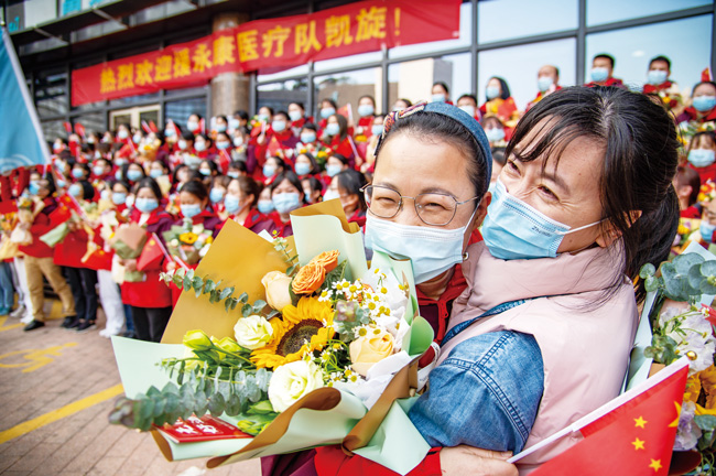 1月12日,4輛大巴在熱情的歡呼聲中駛入金華市中心醫院大門,5天前赴金華永康支援的204名核酸采樣機動隊隊員凱旋。