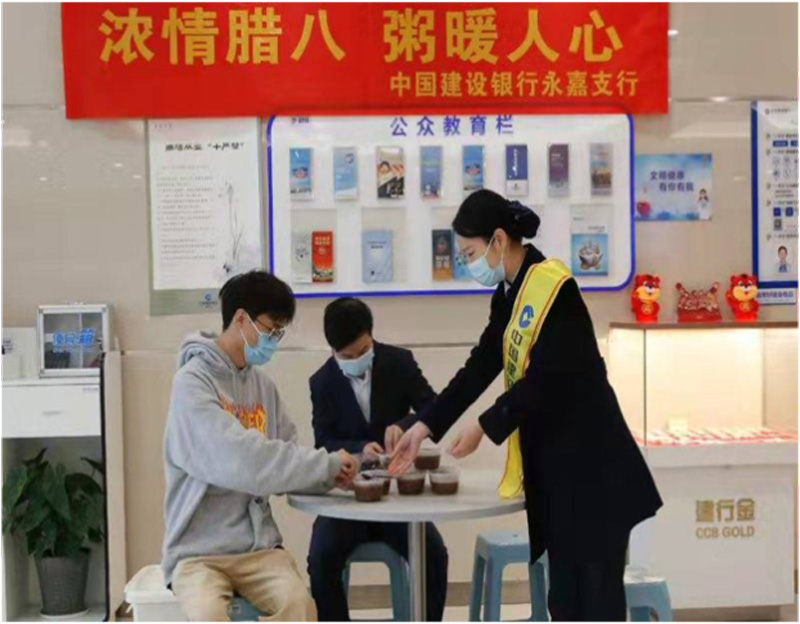 臘八節當天,浙江各地分行“勞動者港灣”紛紛組織開展臘八節公益服務活動。在溫州,全市45個網點的員工一早就忙碌起來,為環衛工人、出租車司機、外賣小哥等戶外勞動者送上臘八粥、大餅等暖心早餐;在湖州,營業網點員工走進社區、派出所、菜場,為寒冬中堅守防疫、治安一線的奉獻者們送上暖粥和春聯;在舟山,岱山支行營業部門口粥香四溢,兩張長方桌、三大桶熱氣騰騰的臘八粥、一份份吉祥的福字禮包,吸引來眾多戶外工作者和過往市民;在杭州,建行潮鳴支行“銀發港灣”邀請潮鳴書法院的老師們開展“翰墨迎春送對聯,建行祝福暖心田”春節送對聯活動,為客戶和勞動者們送上新年祝福。