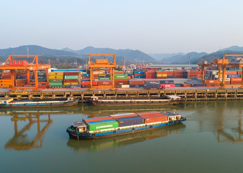 年關將至,安吉上港碼頭一派繁忙景象。大型龍門吊正在忙碌地作業,從駁船上裝卸集裝箱。作為上海港的喂給港,近年來,安吉上港通過“內外貿平衡”轉型升級,穩外貿,提內貿,吞吐量穩中有升。安吉港至上海港的內河國際集裝箱支線班輪,則為區域內的進出口企業降低了25%的物流成本。