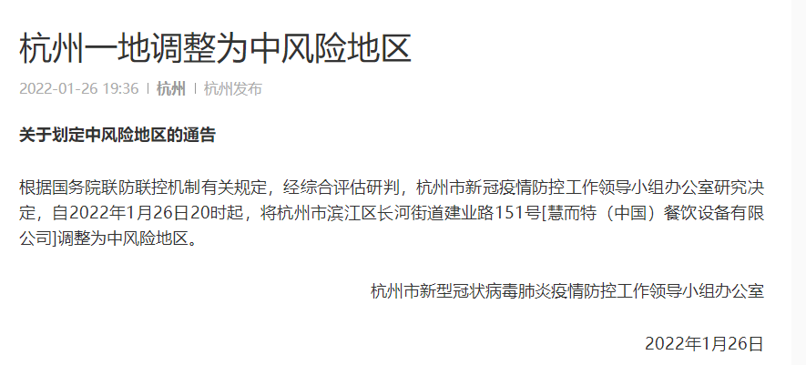 杭州市新冠肺炎疫情防控指揮部發布最新消息,根據國務院聯防聯控機制有關規定,經綜合評估研判,杭州市新冠疫情防控工作領導小組辦公室研究決定,自2022年1月26日20時起,將杭州市濱江區長河街道建業路151號[慧而特(中國)餐飲設備有限公司]調整為中風險地區。