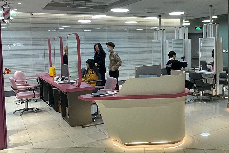 某商場中的理發店,在場顧客和店員中只有一人戴了口罩。孫正祈攝