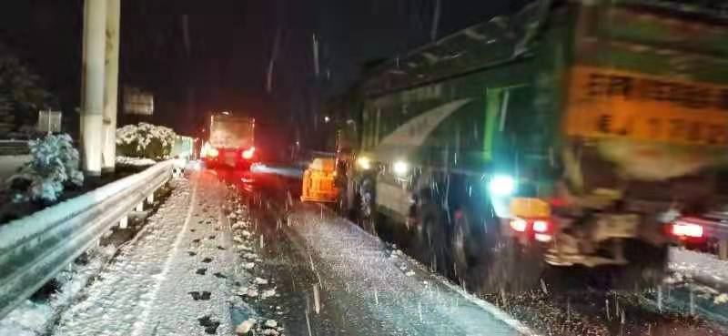 “晚上8點多就開始撒融雪劑,已經撒了183噸了!睋岆U人員說。1月28日17時許,杭徽白果至三陽路段下起大雪,不到兩個小時,路面就積起了雪,杭州北區域中心“聞雪而動”,融雪劑撒布車、推雪板齊上陣,經過多輪的撒融雪劑、推雪作業,于1月29日9時許恢復了路段的通行。