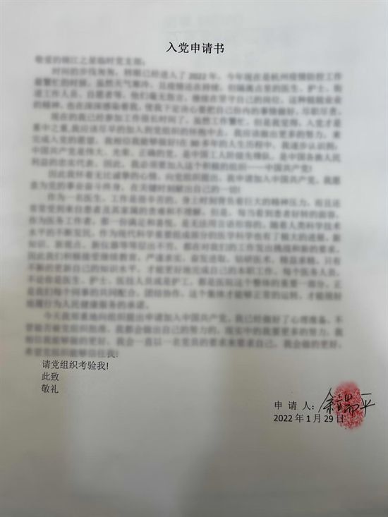 “現在是杭州疫情防控工作最繁忙的時候,雖然天氣寒冷,且疫情還在持續,但隔離點里的醫生、護士、街道工作人員、志愿者等,他們毫無怨言,繼續堅守在自己的崗位,這種兢兢業業的精神也深深感染著我……我逐步認識到:中國共產黨是偉大、光榮、正確的黨,因此懷著無比誠摯的心情,向黨組織提出,我申請加入中國共產黨,我愿意為黨的事業奮斗終生,在關鍵時刻獻出自己的一切!”在杭州市錢塘區白楊街道錦江之星隔離點,剛滿30歲的駐點醫生余端平鄭重地寫下這封飽含深情的入黨申請書。1992年1月出生的他,目前在杭州下沙街道社區衛生服務中心工作,是此次援助隔離點的三名醫生之一。