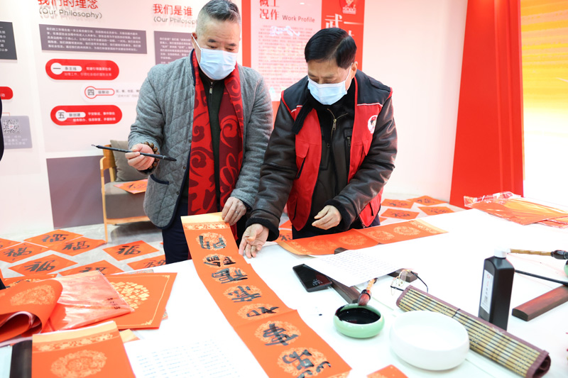 “受疫情影響,許多人不能回家過年,能寫個‘!譃樗麄兯腿ヒ稽c溫暖,我很開心!”正在紅色宣紙上認真書寫祝福的韓天林笑著說。