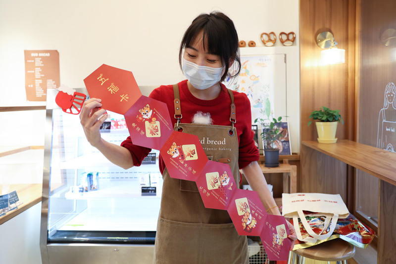 “哇!這張五?ㄌ蓯哿,我要把它掛在店內!”收到“虎”禮包的面包店店員拿出袋內的五?,驚喜地對“武林大媽”說道,“感謝你們冒雨送來的祝福,我會嚴格遵守防疫措施,平安文明過節的!