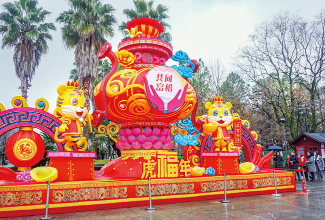 1月30日,在金華婺州古城,造型各異的花燈組與八詠樓、保寧門等古建筑相映成趣,增添了城市街頭濃郁的節日氣氛。除突出虎年傳統元素外,花燈組合造型還結合金華火腿、金華佛手、金華府酒等本地特產,凸顯金華特色,體現金華精神、文明城市創建、共同富裕等多個主題。(吳潮宏)