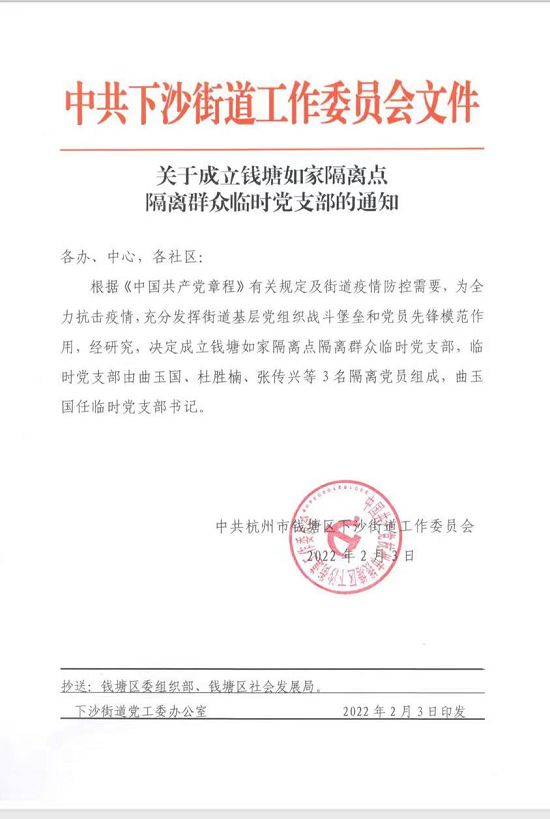 “我們3名隔離黨員正式向下沙街道黨工委提出組建‘錢塘如家隔離點隔離群眾臨時黨支部’申請,請黨組織批準!”2月3日,錢塘區下沙街道黨工委收到來自隔離點隔離人員的一條消息。發送消息的是來自錢塘區人民檢察院的黨員干警曲玉國,他和同被隔離的退休黨員張傳興、醫藥港黨務工作者杜勝楠共同組建了錢塘區首個隔離人員臨時黨支部。這支臨時黨支部的誕生,讓如家隔離點成為錢塘區首個雙支部管理樣本。