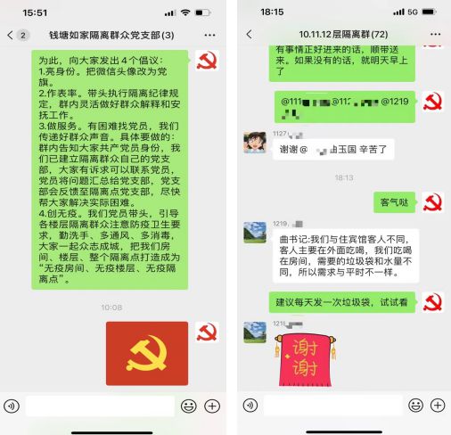 這樣激勵人心的場景也出現在了錢塘區白楊街道一米錦江都城酒店隔離點。書記“點長”袁圍動員隔離群眾中的10名黨員加入隔離點臨時黨支部,通過微信等方式為其他隔離人員紓解負面情緒,在線幫助隔離人員解決難題!斑@次疫情恰好趕上過年,一些隔離人員抵觸情緒較為明顯,我們就想到發揮隔離人員中的黨員作用。作為黨員,他們能起到橋梁紐帶作用,而作為被隔離人員,他們能更好地站在隔離人員的角度思考問題,更有‘現身說法’的說服力、營造積極向上、相互理解的氛圍,也能為我們給予精準服務提供更周到的建議!痹瑖忉尩。