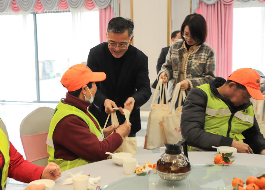 民建湖州市委會主委金凱、南潯區工商聯副主席馮旭康、雙林鎮黨委副書記楊斌及民建雙林支部全體人員參加了此次活動,相關領導干部親切慰問了在場的環衛工人,并將節日慰問品送到他們手上。