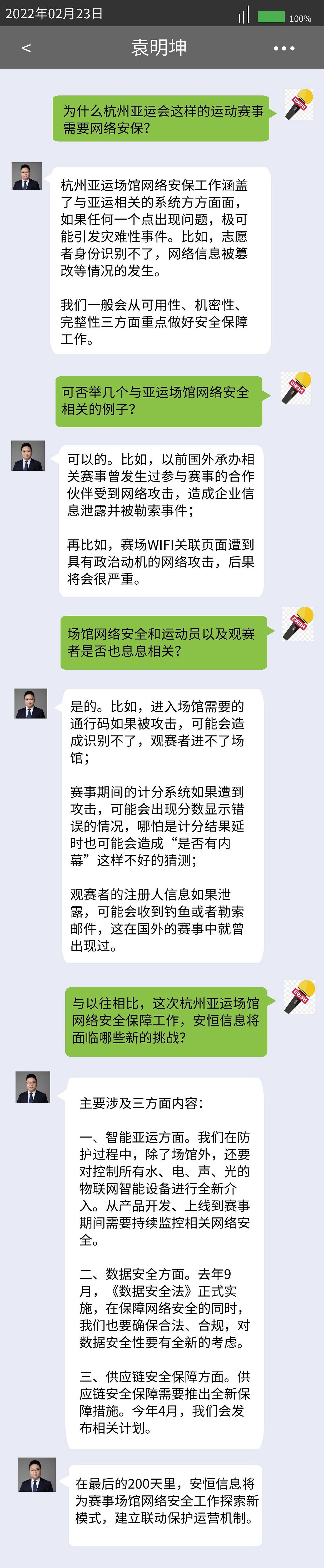 安恒信息作為杭州2022年第19屆亞運會唯一的官方網絡安全服務合作伙伴,已成立亞運辦公室負責亞運專項工作。人民網浙江頻道采訪了杭州安恒信息高級副總裁兼首席安全運營官袁明坤,請他來解答亞運場館網絡安全相關問題。
