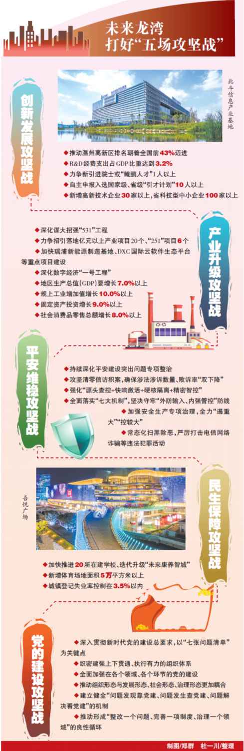 一年的負重前行,變化的是數字,反映的是進步,提振的是信心,體現的是擔當。在黨的二十大召開之年,龍灣已錨定了加快打造“一區五城”,建設活力、美麗、幸福新龍灣,爭創社會主義現代化先行區,奮力打造高質量發展建設共同富裕示范區龍灣樣板的總方向,設定“力爭溫州全市綜合考績優秀”“高新區進入全國前43%”兩大年度目標,闊步新征程、奮斗新篇章。