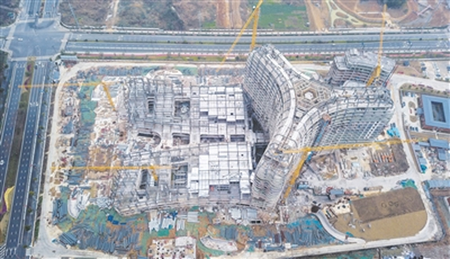在桐廬縣第一人民醫院遷建項目建設現場,項目部復工復產返崗工人已達120多人,施工現場作業正緊張有序開展。目前,醫技樓鋼結構吊裝4層已完成70%左右,樓地面3層澆筑完成,項目主體建設計劃在2022年底前完成。