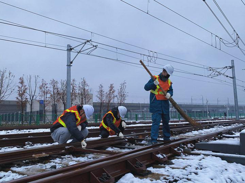 春運期間,杭海城際鐵路掃雪除冰應急隊正在進行除雪作業。浙江軌道集團供圖