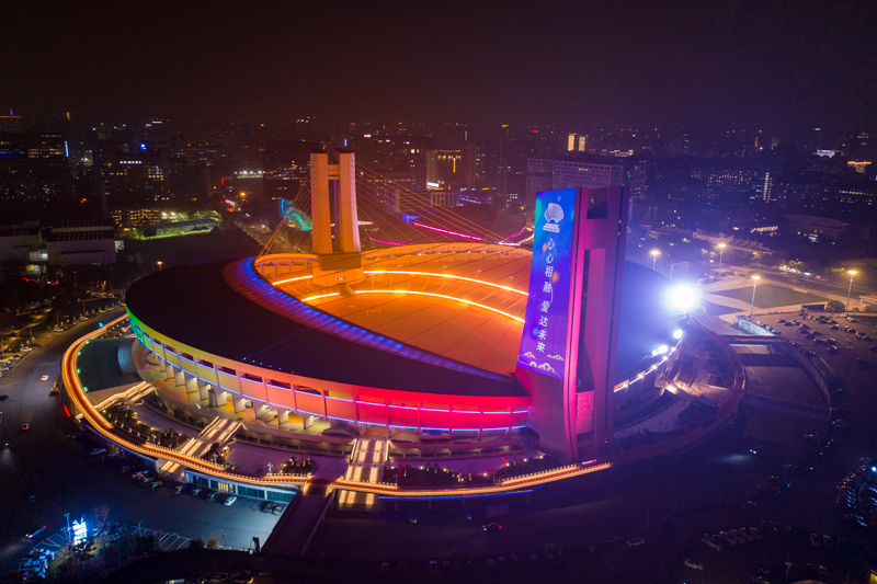 他們站在黃龍體育場錨固草坪上,看著由南北塔“變身”而來的“空中高清大屏”。這塊大屏既可隨時上演美輪美奐的燈光秀,也可實時呈現賽事演出活動的現場畫面。
