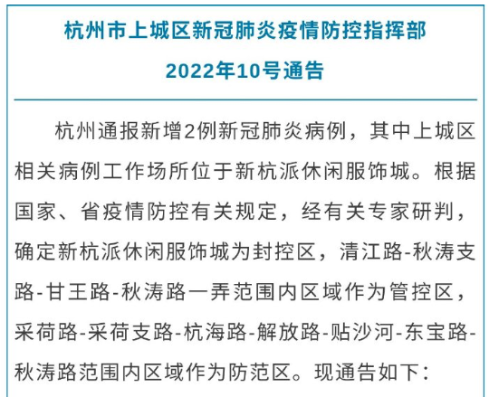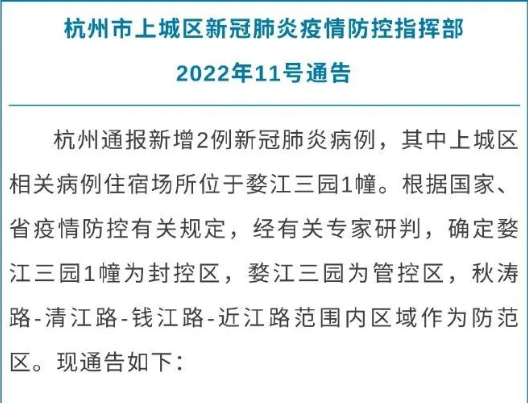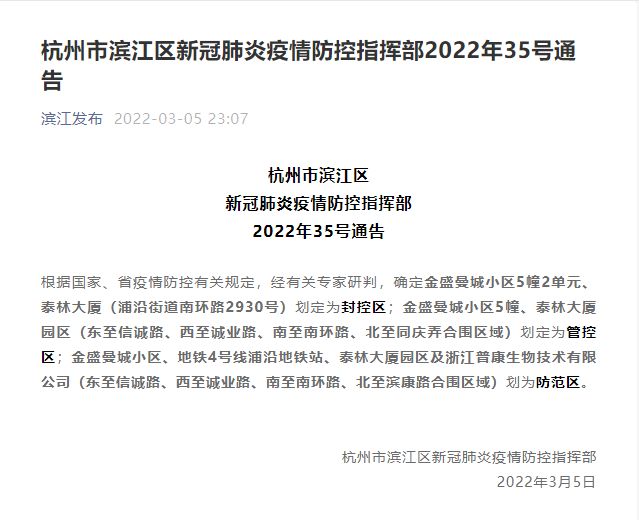 據杭州市濱江區新冠肺炎疫情防控指揮部最新消息,根據國家、省疫情防控有關規定,經有關專家研判,確定金盛曼城小區5幢2單元、泰林大廈(浦沿街道南環路2930號)劃定為封控區;金盛曼城小區5幢、泰林大廈園區(東至信誠路、西至誠業路、南至南環路、北至同慶弄合圍區域)劃定為管控區;金盛曼城小區、地鐵4號線浦沿地鐵站、泰林大廈園區及浙江普康生物技術有限公司(東至信誠路、西至誠業路、南至南環路、北至濱康路合圍區域)劃為防范區。