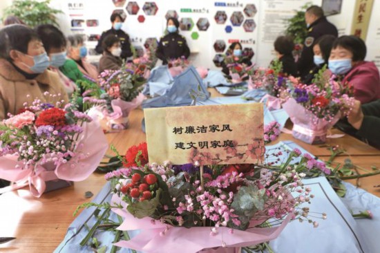 3月7日下午,嘉興南湖區新嘉街道月河社區紀檢監察聯絡站聯合嘉科智慧養老,開展社區插花廉政警示日宣傳活動。特邀花藝師現場指導社區居民、網格員學習藝術插花,并將“樹廉潔家風、建文明家庭”等廉潔卡插在花叢中,寓意常開清廉之花。(趙穎碩)