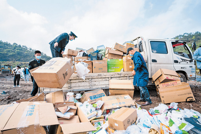 3·15國際消費者權益日當日上午,麗水市市場監管局、市消保委開展罰沒物資集中銷毀行動。罰沒物資被統一裝車運往麗水市蓮都區務嶺根垃圾場依法進行集中碾壓填埋銷毀。此次銷毀的物資是麗水市市場監管局一年來查辦案件的罰沒物資、涉案物品,涉及假冒侵權商品、過期食品、不合格產品等30多個品類,共3萬多件,貨值金額50余萬元。(蘭雷偉)
