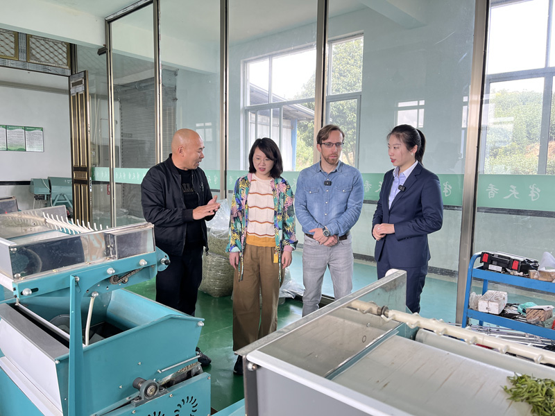 在茶園負責人蔡永游的帶領下,西蒙一家和共富專員們一起走進茶園和茶企,了解茶葉種植、生產有關情況。