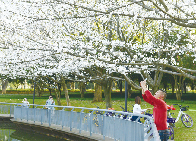3月17日下午,在浙江義烏植物園,數百株櫻花在綠水環抱間悄然綻放。微風拂來,雪球般的櫻花輕輕搖曳枝頭,美不勝收。不少市民和游客前來賞花、拍照,享受春日美景。(錢旭升)