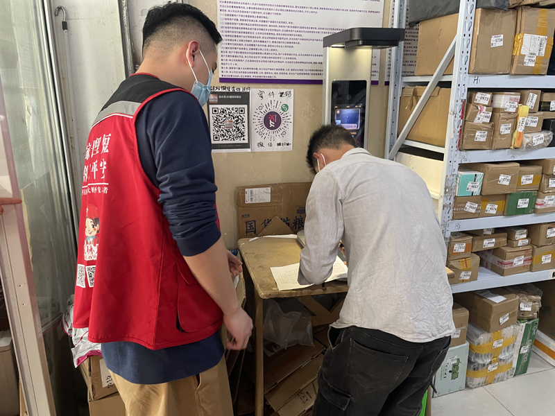 社區工作人員巡查快遞網點防疫落實情況。文暉街道供圖