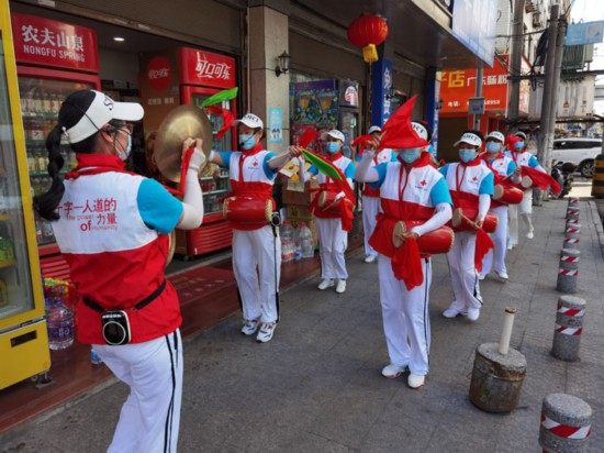 用腰鼓隊宣傳疫情防控工作,這樣別出心裁的宣傳方式,吸引了沿路居民駐足觀看,不少群眾也深受感染,紛紛表示要從自身出發,出門戴好口罩,勤洗手、不聚集,積極做好防疫。志愿者吳小平介紹,眼下疫情形勢緊張,為了讓防疫知識深入人心,隊員放下手頭的事情排演腰鼓節目,用朗朗上口的語言和振奮人心的腰鼓聲,把防疫知識傳達給千家萬戶。