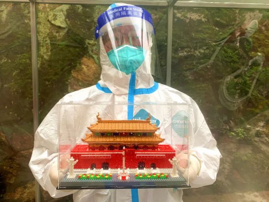 “組長,組長,醫療組有事情匯報,在信息登記處等你呢?”3月28日下午,隔離點組長趙巧巧被醫護人員趙媛媛緊急叫到了信息登記處,原本還以為有突發事件,當她看到拿著天安門樂高積木的“大白”護士黃靖,一口氣才松了下來。