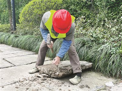 “我們秉持‘最小干預’的原則——結構層穩定的老石板,原則上不修;需要修繕的老石板,則嚴格遵守‘修舊如舊、保留肌理’的原則!焙贾輬@林設計院股份有限公司相關負責人介紹,“一般兩種情況下才進行修復,一是樹池周邊起拱、松動嚴重,二是老石板破損、松動嚴重!