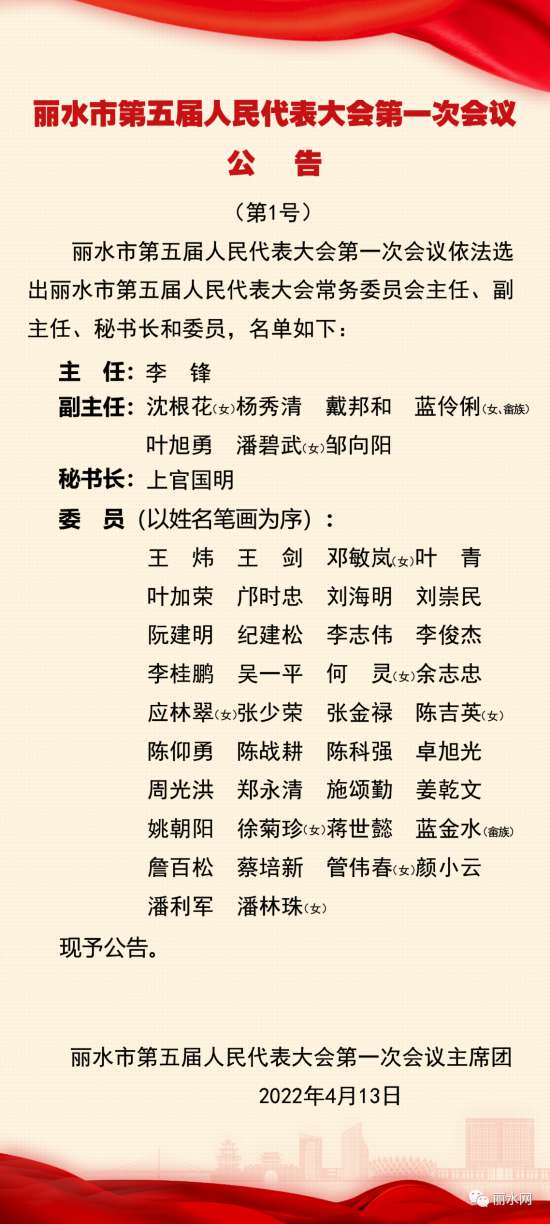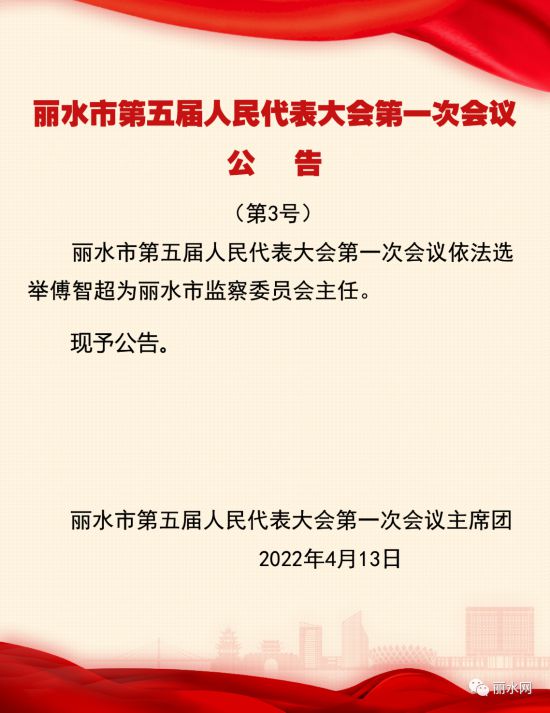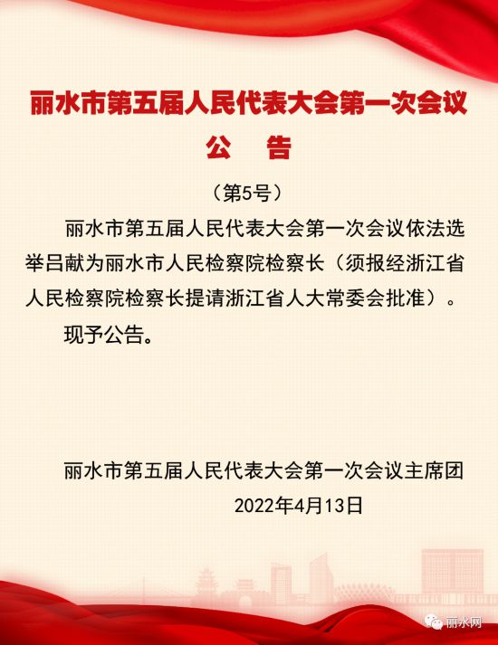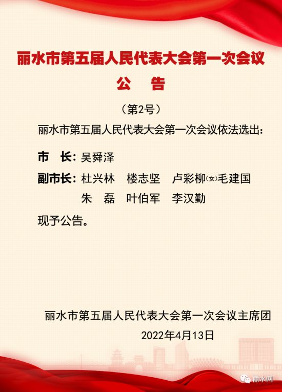 4月13日上午,麗水市五屆人大一次會議舉行第三次全體會議,選舉產生麗水市人大常委會主任、副主任、秘書長和委員,麗水市人民政府市長、副市長,麗水市監察委員會主任,麗水市中級人民法院院長,麗水市人民檢察院檢察長。