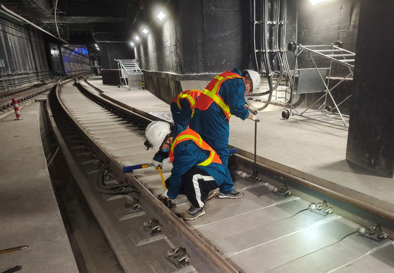 工務中心軌道工班對螺栓進行復緊,防止軌道扣件松動。楊贊銘攝