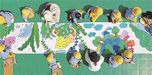 4月21日,臺州仙居縣幼兒園的孩子們在老師指導下創作珍愛地球主題繪畫作品。當日,幼兒園開展以“珍愛地球 人與自然和諧共生”為主題的教育活動,迎接“世界地球日”到來。通過繪長卷、環保時裝秀、垃圾分類等教育活動,引導孩子們愛護環境,共同守護地球母親。