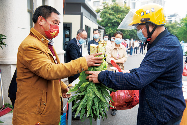 4月23日上午,在金華婺城區城東街道旌孝街社區春江花園小區,物業公司給做完第8次核酸檢測的居民,每戶贈送一份裝有萵筍等蔬菜的禮包。據該小區物業公司負責人介紹,他得知,曹宅鎮前王村農戶種植的萵筍滯銷,便立即組織工作人員與前王村農戶取得聯系,進村購買1500公斤萵筍,又到市場采購番茄、包心菜、土豆等,組合成一個蔬菜禮包,送給小區650戶居民。(時寬兵)