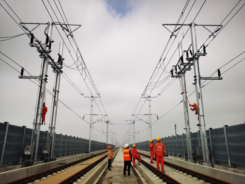 4月24日,湖杭鐵路新建的3座牽引變電所同時向兩邊供電臂送電,伴隨著供電臂終端驗電檢測完成,全線接觸網一次送電成功。此次全線電通,標志著湖杭鐵路電氣化建設基本完成,為即將展開的熱滑試驗和動態檢測提供了動力保障。